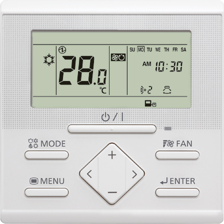 Сенсорная панель с высоким разрешением. Управление группой до 16 внутренних блоков (кроме настенных блоков). Недельный таймер. 2-проводной